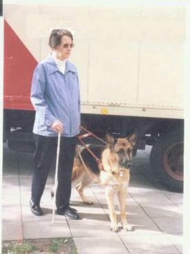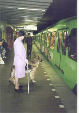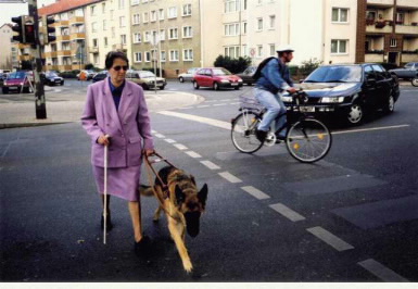 Der Blindenführhund führt über eine Ampelkreuzung. Diese Frage kann man mit einem deutlichen Nein beantworten. Auch oder gerade bei dem heutigen Straßenverkehr ist der Blindenführhund eine optimale Hilfe zur Mobilität des Nichtsehenden. Im Gegensatz zu allen technischen Mobilitätshilfen kann der Blindenführhund mit seinen Augen die Gefahr im Straßenverkehr beobachten und im Notfall entsprechend reagieren. Der Hund wird in einer Spezialschule in einer ca. 6 - monatigen Ausbildungszeit für den Dienst am Blinden geschult. Im Anschluss an diese Ausbildung soll ein gründlicher Einführungslehrgang zusammen mit dem Nichtsehenden von der Blindenführhundschule durchgeführt werden. Dieser Einführungslehrgang ist erforderlich, damit der Blinde über die Pflege und Haltung, nicht zuletzt auch über die Fütterung und die wichtigsten Anfangssymptome der Hundekrankheiten informiert wird. Die Hundekrankheiten kann man auch als Blinder aufgrund des veränderten Wesens bzw. des Verhaltens des Tieres bemerken. Besonders wichtig ist es, dass man die Kommandos und das Laufen mit dem Führhund im Führgeschirr erlernt. In diesem Zusammenhang weise ich darauf hin, dass der künftige Halter dem Führhund die Kommandos genauso erteilen muss, wie es der Vierbeiner in der Schule erlernt hat. Es ist dringend davon abzuraten, die Kommandos nach eigenem Willen abzuändern, da der ausgebildete Blindenführhund mit jedem Kommando etwas Erlerntes verknüpft und dieses dann auch ausführt. Bei unkorrekter Kommandoerteilung kommt es zum Fehlverhalten zwischen Hund und Halter. Hierdurch können Unfälle geschehen. Dieses schließt aber nicht aus, dass man dem Führhund noch zusätzlich einige Anweisungen beibringen kann. Denken Sie aber bitte daran, dass man einem Hund die Anweisungen nicht so erteilen kann wie einem Menschen. Nur wenn der Nichtsehende sich hundertprozentig an das hält, was der Hund und er in der Blindenführhundeschule erlernt haben, kann eine optimale Führleistung erreicht werden. Nach der Gewöhnung an seinen neuen Herren oder seine Herrin ist der Vierbeiner in der Lage, auf genaue Anweisungen alle gewünschten Wege zu gehen und den Blinden sicher an das Ziel zu führen. Nur so stellt der gut ausgebildete Blindenführhund auch heute noch im Großstadtverkehr ein zuverlässiges und beständiges Hilfsmittel des Nichtsehenden dar und gibt ihm somit einen großen Teil seiner Sicherheit und Selbständigkeit zurück. Nachdem der Halter seinem Führhund Halsband, Leine und das Führgeschirr angelegt hat, nimmt er den starren Führbügel in die linke Hand und erteilt dem Vierbeiner das Kommando "voran", wodurch die Führarbeit beginnt. Der starre Führbügel übermittelt dem Blinden alle Bewegungen des Tieres und ermöglicht es ihm, alle Richtungsänderungen mitzumachen und zum richtigen Zeitpunkt das richtige Kommando zu erteilen. An dieser Stelle möchte ich nur einige Kommandos als Beispiel erwähnen, da es Blindenführhundeschulen gibt, bei denen die Vierbeiner bis zu ca. 30 verschiedene Anweisungen ausführen können; und dabei ist keine Ausführung überflüssig. Der Hund führt nur solche Dinge aus, die sehende Menschen durch einfaches Hinschauen wahrnehmen, z.B. "rüber" bei Straßenüberquerung, "rechts weiter", "links weiter", "kehrt", "Tür", "Treppe", "Bank", "steh"', "sitz', "Platz" usw. Selbstverständlich zeigt er auch Bodenerhöhungen und - vertiefungen an. Höhenhindernisse wie z.B. Absperrungen, Äste, die über einem Gartenzaun oder im Wald so niedrig hängen, dass man mit dem Kopfe anstoßen kann, sind für den gut ausgebildeten Blindenführhund keine Probleme.