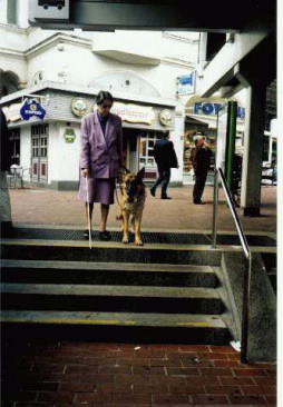 Der BFH führt an einem auf dem Gehweg Für die Ausbildung zum Blindenführhund sollen nur Tiere im Alter von ca. 1 1/2 bis 2 Jahren zur Ausbildung kommen. Erst in diesem Alter sind die Hunde psychisch reif und ausgewachsen. Es ist also notwendig, dass die Tiere in jeder Hinsicht gesund sind. Ältere Hunde führen wegen der ohnehin begrenzten Lebenserwartung entsprechend kürzer. Hinzu kommt, dass die Tiere eine hohe Nervenfestigkeit bei mangelnder Schärfe ohne schlechte Wesenszüge haben müssen. Das heißt, die Angstbeißer, Raufer oder solche, die misstrauisch sind, dürfen nicht zum Blindenführhund ausgebildet werden. Der Einsatz eines human und hundegerecht ausgebildeten Blindenführhundes bietet dem Nichtsehenden viele Vorteile, wenn er bereit ist, Verantwortung für den Vierbeiner zu übernehmen. Der Blindenführhundhalter profitiert nicht nur körperliche sondern auch in psychischer Hinsicht durch die regelmäßige Bewegung an der frischen Luft. Außerdem kann er ohne Hilfe und mit weniger Anspannung alle anfallenden Besorgungen erledigen, da der vierbeinige Begleiter mit seinen Augen für ihn sieht. Es ist wichtig, daß eine blinde Person mit einem gesunden und gut ausgebildeten Blindenführhund einen Einführungslehrgang besucht. Nur so erreicht das Gespann ein wirklich hohes Maß an Mobilität. Es gehört allerdings auch Tierliebe dazu, denn der Hund muss täglich viermal die Möglichkeit haben, seinen Bedürfnissen nachzukommen. Das tägliche Kämmen und Bürsten sowie das Füttern und auch die jährlichen Schutzimpfungen beim Tierarzt sollten für jeden Hundehalter selbstverständlich sein. Mit dem Blindenführhund kann der Nichtsehende eine optimale Mobilität erreichen. Im Gegensatz zu anderen Mobilitätshilfen kann man den Hund nicht an der Garderobe abgeben oder bis zum nächsten Gebrauch in die Ecke stellen, sondern er verlangt die Zuneigung des Halters, die sich dann auch durch gute Führleistung auszeichnet. In diesem Zusammenhang habe ich noch eine Bitte, lenken Sie den Blindenführhund bei seiner verantwortungsvollen Aufgabe nicht durch streicheln oder locken ab.