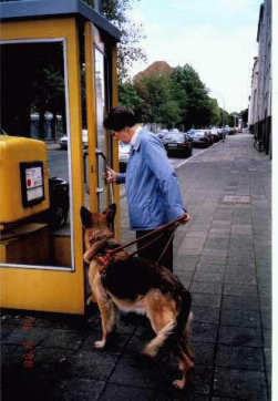 Der BFH hat eine Telefonzelle Verkehrsampeln Treppen - aber niemals Rolltreppen Erkundigt sich ein Blindenführhundhalter nach einer Treppe, dann erklären Sie ihm bitte nur den Weg zur normalen Treppe. Für Hunde, auch Blindenführhunde, ist das Betreten der Rolltreppen wegen der Verletzungsgefahr verboten. Orientierungshinweise im Straßenverkehr durch Ansprechen sind hilfreich - Mimik und Gesten sind sinnlos - Sie können dem Team auf seinem Weg helfen, wenn Sie ihm sagen, welche Linie an der Bus- oder Straßenbahnhaltestelle einfährt; der Blindenführhund kann nicht lesen; Der Blindenführhund ist kein Fakir Werfen Sie keine scharfkantigen Gegenstände auf die Straße, wie z. B. Glas, Dosenringe, Kronkorken, Nadeln oder Reißbrettstifte, Rasierklingen usw.. Durch eine Verletzung seines Hundes wird auch der Blinde in seiner Mobilität stark eingeschränkt. Der Blindenführhund hat auch dort Zutritt, wo andere Hunde nicht mit hineindürfen Da die blinde Person auf ihren Führhund als Begleitung angewiesen ist, darf dieser u. a. in Lebensmittelgeschäfte jeder Art, Restaurants, Arztpraxen, Kirchen, öffentliche Gebäude und Gelände sowie bei Bahnreisen mitgenommen werden. Nach den Länderverordnungen über die hygienische Behandlung von Lebensmitteln tierischer Herkunft ist dieses erlaubt. Bei Flugreisen darf der Blindenführhund zusammen mit seinem nichtsehenden Halter in die Passagierkabine. Beim Kauf eines Flugtickets muss darauf geachtet werden, daß sich das Reisebüro telefonisch von der Fluggesellschaft das Okay holt und dieses auf dem Ticket vermerkt. Aufgrund seiner Ausbildung ist der Blindenführhund von der Pflicht einen Maulkorb zu tragen befreit. Während seiner Ausbildung wird er so geschult, daß er im Dienst nicht schnüffelnd führt, sondern der Vierbeiner lernt für seine verantwortungsvolle Aufgabe seine Augen einzusetzen. Copyright Helga Schmitzius NachtragWer meint, er habe zu diesem Thema etwas interessantes, oder einen Verein, oder einzelne Personen, die sich ebenfalls mit diesem Thema befassen oder eine Spende oder Mitgliedschaft verdienen, schicke uns einen Link. Wir fügen diesen an diesen Artikel an. Die Redaktion