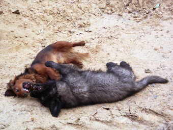 Als er noch so klein wie ein Dackel war ... Wenn er nicht seine fast schon an Traurigkeit grenzende Gleichgültigkeit an den Tag legte, war er ein überaus freundlicher Hund. So freundlich, dass er sich von dem Dackel eines Bekannten alles hat gefallen lassen. In einem Sandhaufen konnten die beiden spielen, bis sie beide wie panierte Schnitzel aussahen. Nur später, wenn der Dackel kam, mußten wir ihn ein wenig zurückhalten, denn durch Zunahme an Größe und Gewicht drohte er den kleinen Dackel förmlich zu erdrücken. Ja, das Wachstum, das war schon eine Geschichte für sich: fragten mich zeitweise unsere Mitmenschen, ob wir dem Hund überhaupt Futter geben, antwortete ich daraufhin: "Ivo hat sich noch nicht entschieden, ob er Hirten- oder Windhund werden will!" Es war wirklich eine Prozedur, ihm das erlesenste Futter heranzuschaffen nebst den geheimnisvollen Pülverchen für glänzendes Fell und starke Zähne.