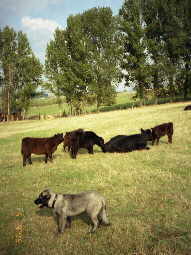 "So viele Spielkameraden!" Ivo im Alter von ca. 5 Monaten Aber, letztendlich haben wir ihn auch groß bekommen und mit einem Jahr sah er dann schon ganz stattlich aus. Er verschaffte sich problemlos Respekt bei den Kühen, mit seiner ruhigen, gelassenen Art haben sie ihn schnell als geduldetes Herdenmitglied angesehen. Das ist ja bei freilebenden Rindern so eine Sache. Im Gegensatz zu den Stallkühen, die den engen menschlichen Kontakt gewöhnt sind, ja sogar vom Menschen abhängig sind (Füttern, Melken), brauchen extensiv gehaltene Hochlandrinder uns Menschen kaum. Demzufolge locker sind auch die Bindungen, bis auf einige wenige Stamm-Mutterkühe, die sich im Laufe der Zeit fast hausrindartig verhalten. Daher wage ich nicht zu behaupten, daß der Hirtenhund Ivo bei denen in der Herde aufgenommen wurde, ebensowenig wie wir auch. Duldung ist das passendere Wort, denn wenn eine Mutterkuh mit Kalb ihre Ruhe haben will, dann kennt sie keine Verwandtschaft.