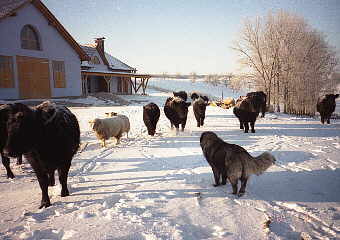 Der erste Winter Ivo 9 Monate alt Diese "andere" Herdenwirtschaft hat auch Ivo die Chancen gegeben, sich als Beschützer zu erweisen: nämlich bei meinen ständigen Herdenkontrollen nach neuen Kälbchen und der Identifizierung der Mütter. Ivo hat sich als "Puffer" erwiesen, der auch mir den "Schutz" vor einer heimtückischen Attacke einer sich von hinten nähernden Kuh gab. Ein lautes Bellen und wildes Gehabe schon waren die Kühe wieder beeindruckt und kauten weiter ihr Gras. Dieses Verhalten legte er auch an den Tag, wenn ich zum Beispiel Kirschen oder Äpfel von der mit Obstbäumen bewachsenen Weide holen wollte. Früher war das immer ein Lotteriespiel gewesen: bekomme ich das gepflückte Obst nun heim oder fallen die Kühe darüber her? Es ist natürlich auch toll, wenn der Bulle, damals der Ernie, fast schon liebkosend seinen Kopf an mir rieb, um die leckeren Früchte zu bekommen aber seit Ivos Wirken gehört das Obst uns! Er "bewacht" einen unsichtbaren Radius von ca: 20 Metern um mich herum, und wehe dem Wiederkäuer, der diesen magischen Ring durchbricht! Als Belohnung gibt es in diesem Falle einen gewissen Anteil an der Ernte, denn Hunde fressen auch gern Obst.