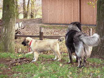Ivo, 1 ½-jährig, mit Neuankömmling Riva Mit Riva wehte ein anderer Wind auf dem Hof, anders ausgedrückt: die junge Dame gab die Richtung an, wo es langgeht! Einen Vorteil des Zweithundes haben wir sehr schnell gemerkt: die Futtermäkelei war ein für alle Mal vorbei, denn nun wurde das Freßchen, egal welches, restlos vertilgt. Die junge Hündin wurde mit Ivos Hilfe in die Gepflogenheiten der Rinderherde eingewiesen und mußte anfangs auch so machen Klauenschlag ertragen. Mit vereinten Kräften wurden von nun an Füchse gejagt, Spaziergänger angebellt und mit den eigenen Küken und Kaninchen geschmust. Nur eines haben wir mit Riva nicht hinbekommen: eines morgens war mal wieder der Wandersmann weg! Aber die Hündin war auf ihrem Platz. Diese Erlebnisse nahmen nun wieder zu und wurden da er nun seine endgültige Größe erreicht hatte immer problematischer. Einmal begegneter er bei seiner "Inspektion" einer Spaziergängerin, ältere Dame, die sofort ihren kleinen Yorkshire-Terrier auf den Arm nahm, als sie ihn schwanzwedelnd herannahen sah. Das war ein Fehler, denn nun versuchte er, den kleinen Hund eben zu erreichen, indem er sich auf die Hinterbeine stellte. Das unvermeidliche Ende dieser Geschichte war eine zerrissene Strumpfhose und eine 500,00 DM-Rechnung der Krankenkasse über eine angeblich erforderliche medizinische Behandlung der Dame. Nun war der Spaß vorbei: und uns wurde eine Kastration angeraten, um seinen Drang, fremde Reviere zu durchstöbern, zu bremsen. Auch mußten wir uns diesen Eingriff überlegen, da bei der Hündin eine schwere HD festgestellt wurde, sozusagen zur Empfängnisverhütung. Diese Operation hatte er gut überstanden, und von nun an mußten wir ihn bei der Ernährung bremsen, da er naturgemäß dadurch an Gewicht zunahm. Heute sind wir um viele Erfahrungen reicher, auch um die, dass nach einer Kastration ein Rüde nicht am "wandern" zu hindern ist. Wenn es uns in den letzten Jahren gelungen ist, diese Erlebnisse zu reduzieren, hat das mehr praktische Gründe. Zum Beispiel die sicherere Einzäunung des Grundstückes. Ganz "dicht" haben wir den Zaun vom mehreren Kilometern Länge nie bekommen, zumal die vorhandenen Wildtiere sich immer wieder ihre Wildpfade hindurchgraben, oder Kinder in ihrer "Freizeitgestaltung" ihre Schneidinstrumente ausprobieren... Eine andere Variante, ihn zur Reviertreue zu bringen, war letztendlich, ihm die ganz wichtige Aufgabe der Bewachung der Kleintiere zu übertragen. Also das Aufhalten in einem ca. 120 m² großen Auslauf am Geflügelstall. Auch ein zeitweises Anbinden an einer 5 m langen, gefederten Leine am Haus nimmt er uns nicht übel.
