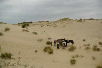 Auch wir haben die Gelegenheit zu einer Reittour. Unsere Nomadenfamilie ist eine bekannte Pferdezüchterfamilie und hat eine riesige Pferdeherde, die weit draußen grast. Einige der Pferde werden eingefangen und bei den Jurten angebunden. Morgens stehen sie gesattelt für uns bereit. Kleine robuste und geduldige Pferde, die uns sicher durch die Sanddünen tragen.