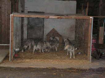 Eingesperrt in einem 3,8 x 3,8 m großem Zimmer, aus dem sie alle 3 - 4 Tage für einige Stunden ins Freie kamen. Nach ca. 3 Wochen kam es zu Streitigkeiten und die Hundegruppe wurde getrennt und zu je 2 Hunden in einem Zwinger gehalten.