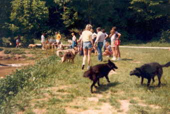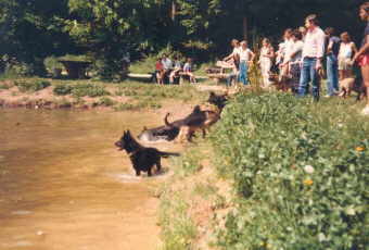Einmal im Monat, immer am ersten Sonntag organisierten wir für unsere Welpenkäufer und befreundete Hundehalter eine Wanderung. Auf dem folgenden Bild ist zu sehen, dass alle Hunde frei liefen, auch heute bei Schäferhunden keine Selbstverständlichkeit.
