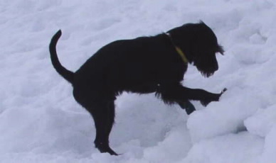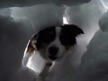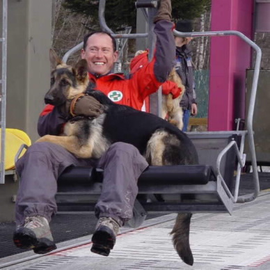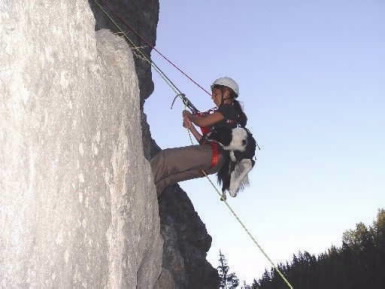 Aufgaben des Rettungshundes Die Ausbildung des Hundes umfasst viele weitere Teilgebiete, von denen hier nur einige genauer erläutert werden. Nachstehende Aufgaben tragen in diversen Prüfungsordnungen den Namen "Gewandtheit". Dazu zählen u.a. Fertigkeiten wie "Tragen und Übergeben", "Fassbrücke", "Wippe", "waagerechte Leiter", "Weitsprung", "Begehen von unangenehmem Material", "Fahren mit Transportmittel" und "Lenkbarkeit auf Distanz", auch "Detachieren" genannt. Angelika Kartner bei der Übung des Sessellift fahrens Tragen und Übergeben Die Notwendigkeit dieser Übung besteht darin, dass der Hund niemandem gegenüber auch nur einen Funken Aggression zeigen darf. Er soll sich von Fremden problemlos hochheben, tragen und auch übergeben lassen. Fassbrücke Ein Holzbrett mit ca. 4 m Länge und einer Breite von ca. 30 cm wird auf zwei gleich große Fässer gelegt. Die Konstellation ist meist beweglich gehalten, und schon beim Aufsprung bewegt sich der Boden unter den Pfoten des Hundes. Geschicktes Ausbalancieren und Gleichgewicht sind hier gefragt. Der Hund hat ungefähr in der Mitte des Brettes zu verharren und darf seinen Weg erst auf Kommando des Führers fortsetzen. Aber auch in einem derartigen Gelände ist Geschicklichkeit des Hundes gefragt Wippe Meist ist diese nicht so komfortabel ausgestattet wie jene, die man aus dem Bereich des Agility kennt. Auch hier dienen meist ein Fass und ein Holzbrett mit schon oben erwähnten Maßen als Konstruktion einer Wippe. Der Hundeführer darf dabei nicht mit seinem Hund von Anfang an mitgehen. Er hat am Anfang des Gerätes zu bleiben und den Vierbeiner bis zum Kipppunkt voranzusenden. Dort angelangt hat der Gefährte zu warten, bis der Hundeführer auf seiner Höhe ist. Gemeinsam wird dann dieses Gerät beendet. Auch in Stollen werden Hunde eingesetzt Waagerechte Leiter Zur Überwindung dieser Leiter, die ungefähr in 50 cm Höhe vom Boden aufgelegt wird, ist dem Hund nur die Benutzung der einzelnen Sprossen, nicht der Holme - der Seitenteile der Leiter - zu gewähren. Am Ende der Leiter wird der Hund vom Hundeführer heruntergehoben. Weitsprung Hierbei kann es sich um einen Wassergraben, ein Sprunggerät oder Ähnliches handeln. Der Hund hat auch dieses Gerät selbstständig zu bewältigen und am Ende wieder zu verharren, bis er vom Hundeführer abgeholt wird. Begehen von unangenehmem Material Baustahlgitter, Folien, Schutt, Blechtafeln etc. kommen hierbei zum Einsatz. Der Hund darf beim Begehen bzw. beim Verharren keine Unsicherheiten zeigen. Gerade beim Einsatz in der Trümmersuche natürlich ist es ein absolutes Muss, hierbei Trittsicherheit zu zeigen. Fahren mit Transportmittel Immer wieder notwendig, um von A nach B zu gelangen. Sei es ein Hubschrauber, der die Teams zur abgegangenen Lawine bringt oder ein Sessellift, eine Pistenraupe oder eine offene Ladefläche eines Transporters oder Anhängers. Die Hunde müssen auch hier Ruhe und Souveränität an den Tag legen. Lenkbarkeit auf Distanz Meist werden dabei Tische verwendet, aber auch Paletten oder Fässer sind zulässig. Diese sind in einer Art Dreieck aufgestellt. Der Hundeführer erhält einen Ausgangspunkt zugeteilt und darf diesen während der gesamten Dauer der Übung nicht mehr verlassen. Der Hund ist mit Hör - und Sichtzeichen auf diese markanten Punkte zu schicken. Dort angekommen hat er aufzuspringen und auf die nächste Anordnung zu warten. Die Reihenfolge, in welcher der Hund die Punkte anzuvisieren hat, ist immer unterschiedlich. Diese wird erst bei Einname des Ausgangspunktes vom Richter festgelegt. Doch nicht nur die Vierbeiner werden geschult und gefordert, auch der Hundeführer hat einiges mitzubringen und zu lernen. Teamfähigkeit und gute Kondition, Erste Hilfe, Orientierung mit Karte und Kompass, Knotenkunde, Schneeprofil und vieles mehr sind in Theorie und Praxis auszuführen. Chiara + Angelika Kartner beim Abstieg Mensch und Rettungshund als TeamWie in jeder Hundeausbildung ist das Ziel, dass das Tun an sich schon zur Bestätigung wird. Hund und Mensch müssen ein eingespieltes Doppel werden, der Hund muss richtig gelesen werden können. Teamarbeit und Vertrauen, nicht nur innerhalb des Teams, sind gefragt, denn anders als bei anderen Hundeausbildungen sind hier sämtliche "Opfer" - welche meist ja ebenfalls Hundeführer sind - für die Ausbildung der "fremden" Hunde zuständig. Auch das sogenannte Opfer muss den Hund richtig lesen und einschätzen können, um ihn bei sich zu behalten (vorausgesetzt, es handelt sich hierbei um eine bellende Anzeige), ihn vielleicht zum Bellen zu animieren und ihn auch zum richtigen Zeitpunkt zu loben. Jedes Mal aufs Neue ist es Faszination pur, Hunde bei dieser Arbeit und bei deren Erfolgen beobachten zu können. Diese großartige Leistung füllt scheinbar völlig mühelos die Lücken zwischen menschlichen und auch technischen Unfähigkeiten. Vor dieser Fähigkeit und diesem Können kann ich persönlich nur meinen imaginären Hut ziehen! Abseilen