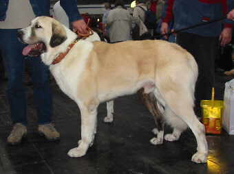 Kuvasz-Siegerehrung Rüden Offene Klasse (Sieger: "Jaszszepe Cakkos") Nach dieser spannenden Schau brauchte ich dann schnell etwas zu trinken, denn die rauchgeladene Luft in der Halle trockneten einem Menschen die Atemwege schon sehr aus. Wie muss es da nur den Hunden ergehen, die durch das Hecheln noch viel mehr der schlechten Luft aufnehmen mussten? Mein Bedürfnis nach Flüssigkeit wurde uns dann insoweit zum Verhängnis, dass wir den einzigen gemeldeten Maremmano und Centralasiaten am Ring 15 verpassten. Den erstgenannten hätte ich gern gesehen, denn über den Züchter des Hundes weiss ich, dass dieser u. a. auch seine Maremmani bei Schafherden einsetzt. Aber der einzige gemeldete Kaukase musste doch gleich kommen? Nein, denn der kam gar nicht erst. Eine "Entschädigung" begegnete uns dann an einem Messestand in Form eines "Besucherkaukasen". Auch mit der Besitzerin konnten wir ein gutes Gespräch führen, und brachte mir die Erkenntnis, bei einigen Leuten doch schon aus dem Internet bekannt zu sein.