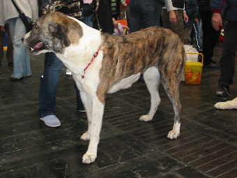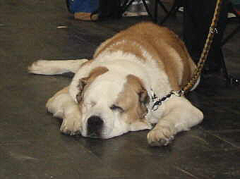 Kaukase (Besucher) Zu guter Letzt fanden wir auch noch einen Centralasiaten - ein mächtiger Bursche, friedlich schlummernd am Ring. Zwar handelte es sich hierbei nicht um die im Katalog eingetragene Hündin, aber nach Katalog-Angaben über den Besitzer musste es sich hierbei um einen mir aus anderen Quellen als turkmenischen "Alabai" bekannten Hund handeln.