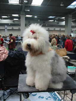 Sage Koochee Nach einem kurzen Gespräch mit den Besitzern und nach der Erkenntnis, dass die Hirtenhunde in Ring 15 noch gar nicht "dran" waren, machten wir uns weiter auf den Weg, die Ringe 9 und 11 zu suchen. Was an diesem Ausstellungstag besser war als im letzten Jahr: es gab alle Hirten- und Hütehunderassen an einem Tag zu sehen. So konnten wir dieses Mal auch die Frisiertische der Bobtailbesitzer bestaunen.