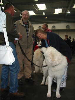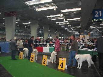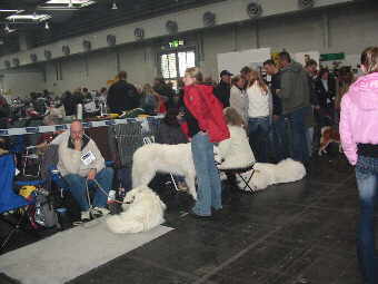 Kuvasz-Rüde "Bundas von den Weißen Lions" (später Platz 2 - Rüden Offene Klasse) Neben den gemeldeten Hunden begegneten uns immer wieder Hunde, die als "Besucher" in der Halle anzutreffen waren.