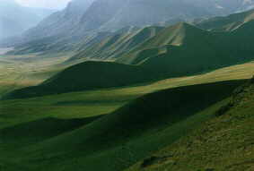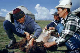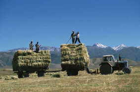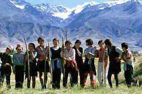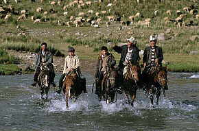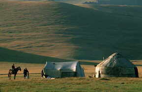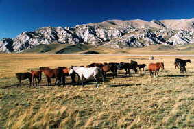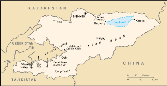 Kirgistan, Land am Tien - Shan Kirgisische Republik Flagge Kirgistans ...Land der Schotterpisten und Schneeleoparden! "Nun sind wir am Fuß des Passes angelangt. Alle sind da unsere Herden, die Familien und die Kinder, der Hausrat und die Jurten. Wir möchten dort hinauf, um das Licht der Welt zu erblicken. Jenseits des Passes liegen die frischen Wiesen und fließen die klaren Flüsse. Wir wollen dort unseren Sommer verbringen. Tschingis Aitmatow "Kindheit in Kirgistan" Geschichte im Schnelldurchlauf rd. 1000 v.Ch. Gründung von Osch im Fergana Tal im Süden. 201 v.Ch. erste Erwähnung von "Kirgisen" in chinesischen Quellen. 840 n.Ch. Entstehung eines kirgisischen Reiches. 13. Jh. Mongoleneinfälle; erste Ansiedlung im Tien - Shan. 1710-1876 Kanat von Kokand, Gründung von Bischkek, ehemals Pischpek. 1876 russische Eroberung von Kokand, Einverleibung in das Zarenreich. 1882 Einwanderung erster deutschstämmiger Siedler (Mennoniten). 1916 mittelasiatischer Aufstand gegen Russland und Emigration von bis zu einem Drittel der kirgisischen Bevölkerung v.a. nach China. 1918 Teil der Autonomen Sozialistischen Sowjetrepublik Turkestan. 01.02.1926 Autonome Sozialistische Sowjetrepublik Kirgistan. 1926 Umbenennung Pischpeks in Frunse. 05.12.1936 Gründung der kirgisischen SSR. 28.10.1990 Der Oberste Sowjet wählt Akajew zum Präsidenten. 31.08.1991 Unabhängigkeitserklärung. 22.12.1991 Beitritt zur GUS. 1993 fallen tadschikische Rebellen im Land ein, die die "gottlose" Regierung stürzen wollen. Darauf verabschiedet das Parlament im gleichen Jahr eine neue Verfassung, die religiös orientierte Parteien verbietet. Bevölkerung Kirgistan hat etwa 5 Millionen Einwohner, 23 Einwohner pro Quadratkilometer und 40 % leben in Städten, nämlich in der Hauptstadt Bischkek (ca. 1 Million Einwohner) und ihrer heimlichen Konkurrentin Osch (ca. 220 000 Einwohner), im fruchtbaren Ferganabecken. Tokmak (ca. 94 000 EW), sowie Dschalal Abad (93 000 EW), Karakol, früher Prschewalsk (80 000 EW) und Kara Balta ( 70 000 EW) sind die größten Städte des Landes. Foto: © Berthold Steinhilber Kirgisen stellen ca. 52 % der Bevölkerung, ca. 22 % sind Russen und ca. 13 % Usbeken. Außerdem leben Tataren, Tadschiken und Aseri (Aserbaidschaner), sowie Ukrainer und Deutsche im Land. Weitere Minderheiten sind Uiguren, Türken, Kasachen, Tadschiken, Koreaner und Chinesen. Übrigens erkannte Kyrgyzstan als erstes Mitglied der GUS Staaten der deutschsprachigen Minderheit Autonomierechte zu. Diese umfasst etwa 17 000 Menschen, von denen 1882 die ersten als Siedler (Mennoniten) einwanderten, weitere kamen im Rahmen der Deportationen unter Stalin ab 1942 ins Land. Sie werden in Begegnungsstätten in Bischkek, Tokmok, Sokuluk, Kara Balta, Belowodskoje, Kant, Talas, Maili-Suu, Osch und Dschalal Abad von kirchlichen und politischen Organisationen aus Deutschland unterstützt. Dort finden neben Seminaren und Vorlesungen über traditionelle und kulturelle Lebensweisen auch solche zur Gesundheitsvorsorge, Psychologie und Berufsorientierung statt. Weiter wird eine Arbeit für Jugendliche in Clubs und Jugendgruppen angeboten. Des Weiteren gibt es soziale Hilfen, nämlich Lebensmittelverteilungen, medizinische Betreuung für Bedürftige und Seniorenkuren. Vorherrschende Religion ist der Islam sunnitischer Richtung. Die Amtssprache Kirgisisch zählt zu den Turksprachen. Auch Russisch ist die zweite Amtssprache. Aufgrund der Gegebenheiten ist Kirgistan nicht gleichmäßig besiedelt. Deutlich mehr als die Hälfte der Bevölkerung lebt im Ferganabecken und auch im Norden des Landes ist die Bevölkerungsdichte höher als im Rest des Landes. Geographische Lage Mit einer Fläche von ca. 199 000 qkm liegt Kirgistan im nordöstlichen Teil Centralasiens und hat gemeinsame Grenzen mit Kasachstan, Tadschikistan, Usbekistan und China. Geteilt wird das Land durch das Gebirge Tien - Shan in die Ebene von Tschui im Norden und das Ferganabecken im Süden. Der höchste Berg ist der Pik Pobeda (in der Landessprache Dschengisch Tschokusu, der Siegesgipfel) mit 7.439 m. Annähernd 90 % des Territoriums liegt über 1500 m hoch, daher wird Kirgistan auch die Schweiz Centralasiens genannt. Administrativ ist das Land in 8 Verwaltungsbereiche aufgegliedert. Nämlich 7 Regionen: - Tschüj Oblasty - Yssyk-Köl Oblasty - Talas Oblasty - Naryn Oblasty - Osch Oblasty - Dschalal-Abad Oblasty - Batken Oblasty und der Hauptstadtbereich Bischkek. Ähnlich unseren Landkreisen gibt es 39 Rayons und 4 entsprechende Bereiche in Bischkek. Die Rayons wiederum bestehen aus noch kleineren Einheiten, den insgesamt 429 Landverwaltungen (Gemeinden, Ail Ökmötü). Die nationale Währung ist der SOM = 100 Tijn, eingeführt am 10. Mai 1993. 1 Euro entspricht etwa 48 SOM. Die Einführung dieser Währung verstieß gegen Abkommen der "Gemeinschaft unabhängiger Staaten" (GUS). Wirtschaft Der wichtigste Sektor ist die Landwirtschaft und erbringt ca. 40 % des Bruttoinlandproduktes. In der Landwirtschaft sind über 40 % der Bevölkerung beschäftigt. Fast 80 % der landwirtschaftlichen Produktion wird privat erzeugt. Hauptprodukte sind: Fleisch, Wolle und Leder, sowie Zucker, Tabak, Seide, Gemüse Getreide und Viehfuttermittel und Kartoffeln. Fotos: © Berthold Steinhilber Der Anbau wird durch ein sehr intensives Bewässerungssystem erst möglich gemacht. Im Jahre 1993 waren z.B. 9 000 qkm Land bewässert. Dazu schreibt mir Kanat :"Da wo ich aufgewachsen bin - im Norden Kirgistans, gibt es keine Wälder. Damit die Landwirtschaft betrieben werden kann, benutzt man ein gut ausgebautes Bewässerungssystem. Z. B. meine Familie hat ein Grundstück, wo wir etwas Gemüse anbauen können. So, pro Sommer müssen wir das Grundstück mindestens viermal bewässern, damit alles nicht austrocknet. Wasser kommt vom Gebirge und wird unter den Dorfbewohnern verteilt." Auch die Zucht von Pferden, Schafen und Rindern spielt eine wichtige wirtschaftliche Rolle. Der Dienstleistungssektor macht 30 % und der Indu