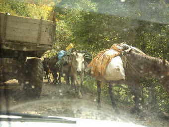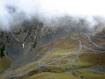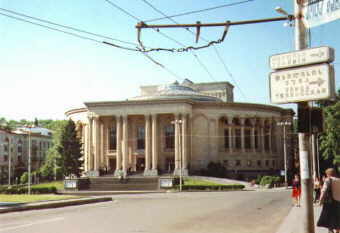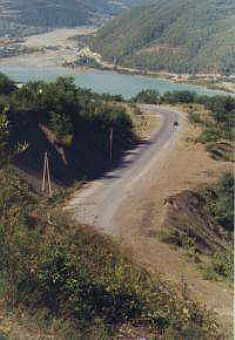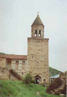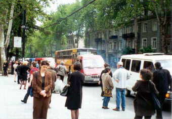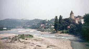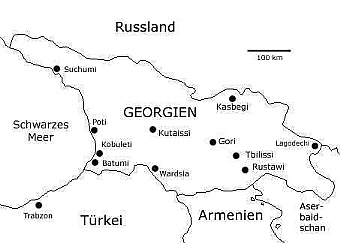 Am Abanopass in Tuschetien Die Fläche von Georgien beträgt 69.700 Quadratkilometer und ist damit etwa so groß wie Bayern. Fast zwei Drittel sind Gebirge. Der höchste Berg ist der Schchara im Großen Kaukasus mit 5.068,8 Metern. Der größte See ist der auf 2.073 Metern Höhe gelegene Parawani mit einer Ausdehnung von 38 Quadratkilometern. Georgien mißt von Ost nach West (Lagodechi - Batumi) ca. 530 km. Von Nord nach Süd (Kasbegi - Rote Brücke, Grenze zu Aserbaidschan) ca. 220 km. Die Einwohnerzahl beträgt etwa 4,5 Millionen Menschen. Am Rionoufer in Kutaissi Flüsse Durch den gebirgigen Charakter des Landes sind die Flüsse Georgiens meist recht kurz. Die meisten der rund 2.000 Quellen liegen im Großen Kaukasus. Sie sind selten länger als ein paar Dutzend Kilometer, bevor sie sind mit anderen Flüssen vereinigen oder in einen Bergsee münden. Ausnahmen bilden der Mtkwari, in der Sowjetzeit Kura genannt, mit 351 km Länge. Er durchfließt die Hauptstadt Tbilisi. Weitere bedeutende Flüsse sind der Rioni, der Alasani und der Enguri, sowie Bshushi, Natanebi, Bachwis Zkali und Gubasouli, in denen man angeln kann. Das Emblem von Tiflis Die Hauptstadt Tiflis mit etwas über einer Million Einwohnern ist die größte Stadt Georgiens. Sie hat eine sehr bewegte Geschichte. Tiflis liegt im Zentrum der Kaukasus Landenge im Osten Georgiens und erstreckt sich in einer Niederung zu beiden Seiten des Flusses Kura (georgisch Mtkvari). Westlich wird die Stadt vom Berg Mtazminda, im Osten von der Hügelkette Machata und im Süden von den Gebirgszügen Mtabori und Solalaki begrenzt. Durch diese hügelige Landschaft wurden viele der Wohnviertel terrassenförmig in die Hänge gebaut. Aber diese gebirgige Lage sorgte auch immer wieder für Erdbeben, denn Tiflis liegt auf einem seismisch aktiven Gebiet. Das letzte große Erdbeben war am 25. April 2002 und forderte 6 Menschenleben und zahlreiche Verletzte. Außerdem wurden in der Altstadt rund 2.000 Wohnungen beschädigt. Der Schaden betrug über 60 Millionen Dollar. Erdbebenschaden Der georgische Name der Stadt Tbilissi bedeutet übrigens "warme Stadt" und leitet sich vom georgischen Wort "tbili", auf deutsch warm ab. Nach einer alten Sage verdankt die Stadt warmen und schwefelhaltigen Quellen auch ihre Gründung. Noch heute sprudelt an den Nordosthängen des Mtabori dieses heiße Quellwasser und wird in zahlreichen Badehäusern genutzt. Die Geschichte der Stadt ist sehr wechselhaft. Urkundlich erwähnt wurde sie erstmals im 4. Jahrhundert, damals unter persischer Besetzung. Rund 100 Jahre später gründete der König Wachtang Gorgassali die heutige Stadt. Im 6. Jahrhundert wurde Tiflis Sitz eines oströmischen Provinzverwalters und im 7. Jahrhundert wurde sie von Arabern erobert. Erst 1121 wurde sie wieder georgisch und dank ihrer günstigen Lage an den europäisch-asiatischen Handelswegen zu einer der reichsten Städte des Mittelalters. Im 15. Jahrhundert fielen die Mongolen ein und rund zweihundert Jahre später wurde Tiflis türkisch, wurde aber von König Rostom zurückerobert und stärker befestigt. Im 18. Jahrhundert wurde die Stadt abermals türkisch, aber Schah Nadir vertrieb die Türken erneut und setzte den georgischen König Theimuras ein. Am Rustaweli-Prospekt 1795 wurde Tiflis völlig zerstört nach einem Überfall der Perser. 1799 besetzte der russische General Lasarus Tiflis und 1801 wurde sie Teil des russischen Reiches und Hauptstadt des Gouvernements Tiflis. Tiflis heutiges Stadtbild wurde etwa in der Mitte des 19. Jahrhunderts geprägt. Alte Stadtmauern wurden abgerissen und die Stadt dehnte sich nach Norden und Westen aus. Im heutigen Stadtzentrum entstanden elegante Wohnhäuser, Paläste und Kirchen, sowie das Theater und die Oper. Außerdem bekam Tiflis einen Anschluss an die Poti-Baku-Eisenbahn. Tiflis von oben 2001 Tiflis ist immer eine multikulturelle Stadt gewesen, so lebten Ende des 19. Jahrhunderts neben Georgiern auch Armenier und Aserbaidschaner, Russen, Tataren, Perser und Polen, aber auch eine kleine Gemeinde von Deutschen in der Stadt. Außerdem gibt es schon immer eine jüdische Gemeinde. Und seit den Kriegen im Kaukasus leben in der Stadt auch Osseten. Daher findet man in Tiflis neben den zahlreichen Kirchen der christlichen Gemeinden auch eine Synagoge und eine sunnitische Moschee. 1883 fuhr die erste Pferdebahn, ab 1904 gab es elektrische Straßenbahnen. Mit der Industrialisierung in den 40er Jahren entstanden große Trabantenstädte mit einförmigen Wohnblöcken. Im Jahre 1972 wurde auf dem Berg Mtatsminda der Fernsehturm erbaut. Pferdekutsche Auch Tiflis hat seine Probleme und Problemchen und die sind: Ein völlig überlastetes Straßensystem, illegal errichtete Gebäude und eine unzureichende Energieversorgung. 1969 wurden zwei U-Bahn Linien eröffnet. Partnerstädte von Tiflis sind Saarbrücken (1975), Nantes (1979), Innsbruck (1982), Bristol (1987), Palermo (1987), Ljubljana, Atlanta und Bilbao. Die Stadt ist das wissenschaftliche Zentrum Georgiens, sie beherbergt die 1918 gegründete staatliche Universität mit 18 Fakultäten, eine Universitätsbibliothek, die Akademie der Wissenschaft, die technische Universität, eine staatliche pädagogische Universität, sowie die medizinische Universität und die Universität für Sprache und Kultur. Insgesamt sind an diesen Einrichtungen mehr als 20.000 Menschen beschäftigt. Auch in Bezug auf Theater und Musik hat Tiflis einiges zu bieten. So z. B. das 1845 gegründete Gribojedow-Theater für russisches Drama, oder das 1921 gegründete Rustaweli Theater. Außerdem gibt es seit 1851 die Paliaschwili Oper sowie die zwischen 1969 und 1971 erbaute große Halle des Philharmonischen Orchesters. Politische Aufteilung Georgien ist ein Land der autonomen und Teilerepubliken. Diese sind durch die verschiedenen "Volksstämme" geprägt. So liegt im Nordwesten Georgiens die autonome Republik Abchasien, im Südwesten die autonome Republik Adscharien, im Norden das Gebiet Südosseti