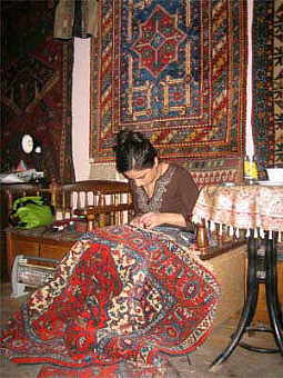 Georgien, Land zwischen dem Großen und dem Kleinen Kaukasus 2. Teil Foto: Irma Berscheid-Kimeridze Die Wirtschaft Georgiens Bereits im 3. Jahrhundert v. Chr. wurden in Georgien Waffen geschmiedet und in andere Länder exportiert. Im Kaukasus wurde nämlich Gold und Silber, sowie Eisen und Kupfer abgebaut. So stellten georgische Handwerker Waffen her, mit denen Griechen und Trojaner kämpften. Im vergangenen Jahrhundert konzentrierte sich die georgische Wirtschaft auf den Tourismus am Schwarzen Meer und auf die Landwirtschaft. Hier besonders auf den Anbau von Zitrusfrüchten und Weinbau. Es gibt einen relativ kleinen industriellen Sektor, der Metalle, Maschinen, Chemikalien und Textilien produziert. Landwirtschaftliche Produkte sind die berühmten Weine. Restauration eines Teppichs Wikipedia schreibt über die Wirtschaft: