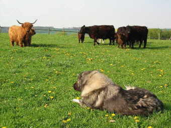 Ivo (li.) und Riva (re.) Alternative Möglichkeiten für den Hirtenhunde-Einsatz "Eßt mehr Bio-Fleisch, " habe ich einmal im Kreise einer Internet-Mailingliste geschrieben, "dann gibt es auch wieder mehr Einsatzgebiete für die Hirtenhunde!" Auf dem ersten Blick sieht man vielleicht den Zusammenhang nicht, aber spätestens auf dem zweiten wird einem klar, daß der Ruf nach artgerechter Tierhaltung ja nicht nur für Schweine in Spaltenbodenställen oder Hühner in Legebatterien gelten muß. Vielmehr sollten die Menschen sich auch Gedanken um die Zukunft ihrer näherliegenden Haustiere, ihrer besten Freunden sozusagen, den Hunden machen. Veränderte Lebensbedingungen haben auch hier zur Folge, daß auch diese sich im Laufe der Zeit verändern; manchmal auch gewollt, was aber nicht immer zum Vorteil der Hunde gereicht, zumal wenn es sich um so alte Arbeitsarten, wie den Hirtenhunden, handelt. Schauen wir kurz in die Geschichte: die erste Aufgabe der Beziehung zwischen Menschen und Hunden war - nach dem Wachen und Jagen - die Herdenarbeit. Die Hirtenhunde sollten den Viehbestand der Schäfer vor den hundeartigen Feinden, wie Wölfe und Kojoten, schützen. Doch der Mensch hat im Laufe der Zeit die Wölfe bejagt und ausgerottet. So mindert sich auch der Zweck der Herdenschutzhaltung. Wie kann man nun neue "Arbeit" für diese alten Hunderassen finden, ohne daß sie nur noch Liebhaber in reicheren Gegenden der Herkunftsländer oder als Export in die modernen Industrieländer finden? Riva bei der "Arbeit" Auch die Landwirtschaft wurde im Laufe der Zeit weiter industrialisiert, Ersatz des Menschen durch die Maschine und aufgrund immer neuer Mastmethoden kann auch auf Weidehaltung bei den Tieren verzichtet werden. Die Folgen kennen wir alle: Skandale, wie Schweinepest und BSE bei Rindern bzw. Scrapie bei Schafen. Ein Umdenken und vor allem ein geändertes Verbraucherverhalten könnte in der Landwirtschaft eine Wende zur naturnahen Erzeugung von Lebensmitteln, wie Fleisch, führen. Vorreiter sind die bekannten ökologischen Anbauverbände wie Bioland, Demeter und Gäa. Dem besonderen Schutz von vom Aussterben bedrohter Nutz- und Haustierrassen hat sich die GEH mit dem Arche-Projekt verschrieben. Bauern, die auf Bio umstellen, oder Neueinrichter können mit der Förderung ihrer Vorhaben rechnen. Bei einem kontrollierten Viehbestand unter 1,4 Großvieheinheiten je Hektar ist nicht mit Schädigungen der vorhandenen Vegetation zu rechnen, wobei ein ausgewachsenes Rind 1 und ein Schaf 0,1 Großvieheinheit darstellen. Die Beweidung durch Schafe oder Rinder stellt im Vergleich zur Mahd oder gar dem Einsatz von chemischen Spritzmitteln einen natürlichen, kostengünstigen und schonenden Weg dar, die jeweilige Flora und Fauna zu erhalten und damit auch bedrohten Pflanzen- und Tierarten einen entsprechenden Lebensraum zu bewahren. Aufmerksam wird jeder Vorgang auf der Weide registriert Diese Form der extensiven Tierhaltung praktizieren wir als Bioland-Betrieb seit 1993 in einem Landschaftsschutzgebiet in der Magdeburger Börde. Während in Bereichen der intensiv bewirtschafteten Ackerflächen viele heimische Tierarten in ihrer Existenz bedroht sind, können wir seit einigen Jahren die Ansiedlung neuer Feldhasen- und Fasanenpopulationen auf unseren Weideflächen beobachten. Den Beweis, daß eine ökologisch vernünftige Weidewirtschaft auch nicht den Artenreichtum der Pflanzen beeinträchtigt, haben wir bereits in mehrjährigen Bestandsaufnahmen für das Umweltamt angetreten (Veröffentlichung im "Fleischrinderjournal" 3/96). Schon nach dem ersten Winter ohne erwähnenswerte Zufütterung - bei Schnee Heu und Stroh -, kamen die ersten Wildkräuter zum Vorschein, die man aufgrund des zu starken Grasbewuchses bis dahin nicht bemerkte, und die zum Teil auch nicht vorhanden waren. Durch die Rinderhaltung, die im Laufe der Jahre durch Schafe und Pferde ergänzt wurde, kamen viele Singvögel, die zum einen ihre Nahrung in den "Kuhfladen" suchten, zum anderen aber Samen von anderen Pflanzenarten mitbrachten. Die Schafhaltung zur Fleischerzeugung bzw. Landschaftspflege ist regional unterschiedlich, geht aber immer weiter zurück - und wird meistens nur noch mittels Schäfer- und Hütehunden ausgeübt. Neuerdings kehren die Wölfe in die deutschen Wälder und Heidegebiete im Südosten zurück. Das wäre schon einmal eine Möglichkeit, dort die Schäfer davon zu überzeugen, diese zur Abwendung der neuen Gefahr von den Herden einzusetzen. Viel anders ist es bei der Haltung von Hirtenhunden bei einer Rinderherde im Freiland nicht. Gefahren lauern hier nicht durch Raubwild, oder nur für die Kälber, denn selbst sind diese Tiere sehr wehrhaft, vor allem in der Phase des Kalbens und Aufziehens der Kälber - nein auch viele Menschen, die in der heutigen Zeit aus Übermut Schaden an den Zäunen verursachen oder Zuchtvieh-Diebstahl kommen vor. Hier reicht schon die Präsenz von Hirtenhunden, um von vornherein diese üblen Zeitgenossen am Durchführen ihrer Taten zu hindern. Die frühe Zusammenführung der Hunde mit den Rindern stellt einen wichtigen Faktor für den Erfolg der Herdenarbeit dar. Riva, mein "Mädchen" Auch beim Schutz von Pferden gegen die berüchtigten Pferderipper müßte die Möglichkeit des Hirtenhundeinsatzes geprüft werden. Dazu ist sicher eine Prägung der Hunde von Geburt an auf Pferde nötig. Pferde, vor allem Fohlen, Jährlinge oder Hengste, wehren sich und spielen auch anders als Schafe und Rinder. Einem ahnungslosen Welpen kann durch die Hufen oder durch Bisse im Übermut Schaden zugefügt werden. Selbst Pferde untereinander gehen manchmal nicht "zimperlich" miteinander um. Geflügelhofbetreiber können sich auch der Schutzeigenschaften der Hirtenhunde bedienen. Hühner und Gänse lassen sich in ihrem Auslauf gegen Raubwild, wie Fuchs oder Hühnerhabicht, von einem Hirtenhund "beschützen". Bei der Suche nach neuen Einsatzgebieten sollte man sich die Eigenschaft der Hirtenhunde als Territoriumswäch