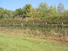Doppelzaun aus Holzpfählen mit Knotengeflecht mit innerer Hecke aus Sanddorn, Die Herstellung eines bepflanzten Doppelzaunes mit Erdwall ist sehr aufwändig, bietet aber noch mehr Sichtschutz: