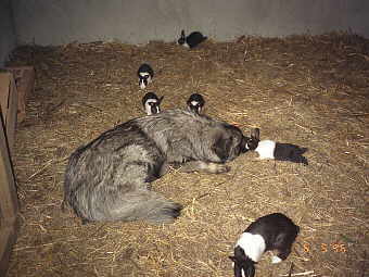Welpe Ivo schmust mit seinem Vater, Tim z Cerhovickych Drah Am 17.06.1995 war der große Tag: Ivo konnte geholt werden! Die Fahrt von Hettstedt nach Hohenwarsleben war für den Kleinen eine Tortour. Nicht, dass wir es ihm nicht bequem gemacht hätten nein nachdem er sich gleich nach Fahrtantritt übergeben hatte, tat er das dann noch mehrmals auf meinem Schoß, wohin ich ihn dann genommen hatte. Mit dieser "Fahruntauglichkeit" in geschlossenen Fahrzeugen hat er noch lange Zeit zu kämpfen gehabt. Wenn mir jemand sagte, sein Hund fährt gern Auto und springt freudig hinein, dann konnte ich nur ungläubig den Kopf schütteln. Bei Ivo war schon beim Anblick derselben die Lust aufs Fahren vergangen. Obwohl der Kleine natürlich ein richtiger Hirte werden sollte, habe ich ihn in den ersten Tagen überall mit hinnehmen wollen. Wegen der o. g. Fahruntauglichkeit war dies dann aber nicht mehr möglich. Trotzdem habe ich in den wenigen Tagen seiner Einführung in die "Zivilisation", und zwar meiner Büroarbeit, etliche "kluge" Leute kennengelernt, die mir Tipps für die Hundehaltung geben wollten. Von Anfang an machte er eigentlich immer das Gegenteil von dem, was man erwartete. So legte er sich nie auf ein von mir eingerichtetes Kuschellager nahe meinem Schreibtisch, sondern verbrachte den Tag lieber auf den kalten Fliesen des Flures. Ein Ereignis brachte mich gänzlich zum Zweifeln an meiner Eignung als Hundehalterin: eine junge Frau, die nach eigenen Angaben bei der Polizei Schutzhunde ausbildet, interessierte sich sehr für Ivo. Auf Ihre Frage hin, um welche Rasse es sich handele, und sie diese nicht kannte, sagte ich: "Das ist ein HerdenSCHUTZhund". Danach wollte sie sich mal den jungen Hund ansehen. Ich nahm sie mit auf den Hof, wo Ivo nun mittlerweile den Tag verbrachte, und stellte ihn vor. Nachdem sie sein Verhalten auf einige, in der Schutzausbildung übliche, Übungen geprüft hatte, gab sie ihr vernichtendes Urteil ab: mit diesem Hund kann man überhaupt nichts anfangen, zeigt nicht die erwünschten Reaktionen, ja sogar eine gewisse Gleichgültigkeit. Nun gab es nur zwei Möglichkeiten: entweder habe ich etwas verkehrt gemacht, oder dieser Hund ist eben anders!