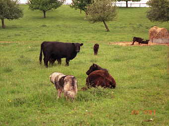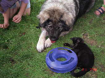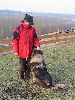 Foto: Dorette Knobbe RivaAus dem "Arbeitsleben" einer Hirtenhündin Über meine Hündin Riva hatte ich bereits im März 2006 ein "Hundeportrait" fertig geschrieben. Nun schreibe ich es neu, denn durch ihren plötzlichen Tod nach kurzer, aber schwerer Krankheit soll das, was der "Lebenslauf eines Hirtenhundes" werden sollte, ein sehr persönlicher Dank an die fast 10 Jahre mit einer wunderbaren Freundin werden. Aber alles der Reihe nach. Nach einem Jahr Erfahrung mit einem Sarplaninac-Rüden zur Bewachung von Hof und Herde wollte ich 1996 mit einen zweiten Hund, besser gesagt: einer Hündin, das "Rudel" erweitern. Ein Gelände von 22 Hektar ist nicht mit nur einem Hund zu bewachen - und ich hatte ein kleines Fünkchen Hoffnung, dass sich die "Spaziergänge" meines Rüden Ivo außerhalb des Reviers dadurch verringern würden. Zu diesem Zwecke wandte ich mich wiederum an den zuständigen Zuchtverein in Deutschland um Hilfe bei der Auswahl einer Hündin. Der Verein war sehr daran interessiert, "frisches Blut" in die Sarplaninac-Gemeinde Deutschlands zu bekommen, und unterstützte mich mit der Vermittlung einer Hündin aus Kroatien. Eine eventuelle spätere Zuchttätigkeit habe ich nicht ausgeschlossen, und so war es erforderlich, eine nichtverwandte Hündin für den Rüden zu suchen. Das war schwerer als gedacht, denn nach Auskunft der Zuchtleitung gab es zu der Zeit in Deutschland keinen Züchter, der einen passenden Wurf ohne Blutsverwandtschaft zu unserem Rüden Ivo hatte. Bald schon erhielt ich die Nachricht vom Verein, daß ein weiblicher Welpe gefunden wurde, und zwar bei einem kroatischen Züchter. Ein in Deutschland lebender Kroate brachte mir die Hündin bis nach München entgegen. Die junge Hündin, zu dem Zeitpunkt ¼ Jahr alt, holte ich mir dann dort ab, um sie zu unserem Bauernhof bei Magdeburg, ihrem zukünftigen "Einsatzort" zu bringen. "Rivas Reise" habe ich bereits seit längerer Zeit auf meiner Webseite veröffentlicht. Am Tag nach der Ankunft, Wie auch mein Rüde Ivo, so blieb die Hündin sehr bald draußen, bei den anderen Tieren und natürlich Ivo. Wie auch der Rüde, so hatte die Hündin vermutlich in den ersten Lebenswochen auch keinen Kontakt zu Nutztieren bzw. einer Herde, so dass die Gewöhnung an die Tiere grundsätzlich das Wichtigste überhaupt für den Einsatz als Hirtenhund war. Eine ausschließliche Haltung der Hunde in der Herde mit minimalem menschlichen Kontakt, wie es oft bei Haltungen in den Herkunftsländern geschildert wird, wollte ich nicht. Wie in den "modernen" Koppelhaltungen üblich, ist das Revier eingezäunt. Unsere Hunde sollten allein entscheiden, wo sie sich aufhalten, und auch von den Hof- und Wirtschaftsflächen haben sie einen guten Überblick über das Gelände. Die ersten Begegnungen zwischen Ivo und Riva liefen wie folgt ab: Ivo, freudig schwanzwedelnd, versuchte sich anzunähern, und Riva legte sich hin, um den unbekannten Rüden schnüffeln zu lassen. Diese Zurückhaltung dauerte nicht lange, denn bald schon nahm die Kleine "das Zepter in die Hand". Neugierig lernte sie die Tiere kennen: Rinder, Pferde, Schafe und allerlei Kleingetier wie Hühner und Kaninchen. Ivo, der sich ja bereits "auskannte", folgte ihr überall hin. Das Verhalten der Hündin war von Anfang an anders, als ich es vom Rüden gewöhnt war: während Ivo eigentlich zu jedem fast schon anbiedernd freundlich reagierte, verhielt sich Riva distanziert zu anderen, aber sehr liebevoll zu mir. Damit meine ich aber keine überschwenglichen Freudentänze, sondern die stumme Verbundenheit und ständiger Augenkontakt. Unterschiedliche Charaktere sind wie bei uns Menschen auch innerhalb einer Hunderasse selbstverständlich auch vorhanden. Und Riva verhielt sich für unsere "Zwecke" eben charakteristischer als Hirtenhund. Hinzu zählen würde ich die Ignoranz die sie den vorgestellten Besuchern oder Handwerkern entgegenbrachte, bis hin zum Ersatz einer Hausklingel, da sie jede Bewegung am Hoftor zuverlässig meldete. Riva, ¾-jährig, bei den Kühen Wie auch meinen ersten Hirtenhund, Ivo, habe ich auch Riva ohne "Erziehungsratgeber" oder Hundeschulenbesuche zu einem problemlosen Hund, mit dem man sich auch in der Stadt und beim Tierarztbesuch, zeigen lassen konnte, erzogen. Vielleicht spielte auch dabei die "freie Haltung" eine große Rolle. Um bei dieser Haltungsform der Hunde die entsprechende Bindung zum Rudel zu erhalten, haben wir unser Leben den Hunden so angepaßt, dass sich unser Tagesablauf ¾ des Jahres im Freien abspielt. Keiner unserer Hunde hatte es zu dieser Perfektion gebracht, mit der Riva die Verbindung zu uns im Hause hielt, indem sie öfters mit der Vorderpfote an die Terrassentürenscheiben "klopfte". Eine "Ausbildung" für den Einsatz als Hirtenhund hat Riva nicht bekommen sie lernte alles, was sie für die Herdenarbeit brauchte, im alltäglichen Umgang mit den Tieren und mir, so dass wir uns im Laufe der Jahre als "eingespieltes Team" bezeichnen konnten. Bei den täglichen Weiderundgängen habe ich ständig den Kontakt zu den Hunden gehalten, indem ich immer mit ihnen sprach, sagte, was ich von ihnen wollte, und Fehlverhalten gleich korrigierte. Bei der Arbeit an der Herde kann es verheerende Folgen haben, wenn die Hunde machen, was sie wollen, daher ist ein gewisser Gehorsam auch bei Hirtenhunden erforderlich. Riva war ein Paradebeispiel dafür, dass man bei solchen Hundecharakteren sensibel vorgehen muss, und den Hunden den Stolz und die Würde nicht nimmt. Mit der Zeit lernte auch ich, zum Beispiel, dass immer ein Grund vorlag, wenn sie einen meiner Rufe nicht befolgte, zum Beispiel, verkroch sie sich einmal im Pferdestall, und ich versuchte, schon fast wütend, sie zum Herauskommen zu bewegen. Der Grund wurde mir dann Minuten später klar: es zog ein fürchterliches Unwetter auf, und sie suchte einfach nur Schutz. "Pudelnass" im Stall Mit einem "Drill" war also auch bei Riva nichts zu machen, und so verlangte ich auch nichts von ihr, was sie für die Arbe