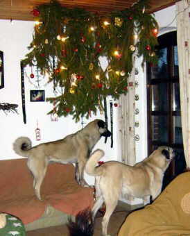Dem wäre nicht mehr viel hinzuzufügen, höchstens eines noch: für die Katzenbesitzer gibt es natürlich auch noch eine Lösung. Und die lautet: Der große Zweig einer alten Fichte an die Decke gehängt, ist das die Version für diese. Wir sind ganz sicher: befolgt man diesen Ratschlag, freut sich der Weihnachtsmann und Hund und Katz und Besitzer werden von diesem gelobt und beschenkt. In diesem Sinne wünschen wir viel Spaß und gelungene Feiertage! Hartmut Deckert P.S.: Die Antwort auf die Frage Blödsinn oder eine gute Idee hat sich sicher selbst beantwortet: eben eine wirklich gute Idee. Vielleicht hat ja jemand aus unserer Leserschaft eine ähnlich gute für Ostern. Den geteilten Pfingstochsen übernehmen wir dann wieder selber, denn die nicht benötigte Hälfte kommt auf unseren eigenen Grill. Alle Fotos von Karin Brüseke, und dafür ein Dankeschön!