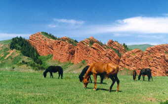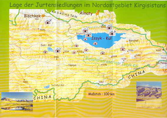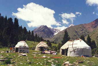 Centralasiaten in Kyrgyzstan! Eines der Ursprungsländer der Centralasiaten ist Kyrgyzstan, ein in Europa ziemlich unbekanntes Land. Wie auch die anderen Länder mit der Endung "stan" hat es einen eher schlechten Ruf. Aber das Land ist seit Jahren dabei, sich touristisch zu erschließen. Dazu kommt, das es politisch sicher ist. Anbieter eines Urlaubes der besonderen Art ist Thorsten Harder in Zusammenarbeit mit dem NABU (Naturschutzbund Deutschland). Er lebt seit Jahren im Land und hat als Besitzer mehrerer Centralasiaten auch die nötigen Fachkenntnisse. Das besondere an diesem Urlaub: Es bestimmt nicht der Anbieter, sonder der Gast kann in Absprache mit dem Veranstalter seinen Aufenthalt selbst gestalten. Daher sind wir schon etwas stolz, für dieses Angebot Werbung machen zu dürfen und auch darauf, daß wir die ersten sind, die es auf einer Hirtenhundeseite veröffentlichen! Und das bietet er an: Natur und Kultur in Kirgisistan Das Urlaubsgebiet Ein kleines Land in Mittelasien Kirgisistan ist eine ehemalige Sowjetrepublik und gilt unter diesen als politisch äußerst stabil. Hier leben ca. 4,6 Millionen Menschen, von denen die Mehrheit Kirgisen sind. Daneben spielen vor allem Russen, Usbeken, Kasachen und auch Deutschstämmige eine Rolle. Die Hauptstadt ist Bischkek (früher Frunse), liegt im Norden des Landes und hat ca. 1.000.000 Einwohner. Über 90 % der Landesfläche liegen höher als 1.000 m. Reiseziel : Das Biosphärenreservat "Issyk-Köl" liegt im Osten des Landes und ist mit seinen 43.000 km² eines der größten Biosphärenreservate (Schutzgebiete) der Welt. Daneben besuchen wir auch das benachbarte Naryn-Gebiet, halten uns jedoch die gesamte Zeit im Nord-Osten von Kirgisistan auf. Wetter Bedingt durch seine südliche Lage sind die klimatischen Voraussetzungen für einen Urlaub am Issyk-Kul geradezu ideal. Die Region verzeichnet mehr als 250 Sonnenscheintage im Jahr. In den Bergen haben wir völlig anderes Wetter zu erwarten. Gewöhnlich scheint die Sonne, aber es kann jeden Tag auch zu Gewitterregen oder manchmal Hagel kommen. Selten regnet es 2 Tage hintereinander. Die Temperaturen liegen tagsüber zwischen 3°C - 15°C (im Juni am Son-Köl) bis 15°C - 25°C (im August). Den ganzen Sommer sinken die Temperaturen am Son-Köl (über 3.000 m) nachts auch mal unter Null. Die Wassertemperaturen im Issyk-Kul : Juni 14 - 17° C, Juli 17 - 20° C August 20 - 23° C, September 18 - 20° C Vegetation Mittelasien ist bekannt vor allem für seine Ephemeren-Flora. Krokusse und wilde Tulpen blühen in den Halbwüsten und Steppen von Mitte April bis Mitte Mai. In Kirgisistan wachsen 20 wilde Tulpenarten, 67 Lauch-Arten (Allium sp.), 13 Lilienschweife (Eremurus sp.), von denen viele nur hier vorkommen. Abhängig von der Höhenlage und Hangexposition finden wir im Bereich einer Unterkunft Steppenvegetation mit Wermut und Federgräsern (Blütezeit Mai auf 1.800 m), montane Trollblumen- u. Knöterichwiesen (Blütezeit Anfang Juni auf 2.200 m), Wälder der endemischen Tien-Shan-Fichte nur an den Nordhängen zwischen 2.000 m und 2.900 m, während am Südhang Steppe mit Rosengebüsch und Wacholderhainen anzutreffen ist. In der subalpinen und alpinen Stufe dominieren Riedgras (Kobresia sp.), Edelweiß und eine enorme Anzahl verschiedenster anderer Blütenpflanzen (Blütezeit ab Mitte Juli). Ab 3.800 m begegnen wir einer Hochgebirgs-Tundra mit Polsterpflanzen und Mooren auf Dauerfrostböden. Tierwelt Die vertikale Zonierung führt gleichfalls zu einer zoologischen Vielfalt. Von den über 360 beobachteten Vogelarten erwecken folgende ein spezielles Interesse: Ibisschnabel, Himalaya-Königshuhn, Bergrubinkehlchen, Mönchsgeier, Bartgeier, Schneegeier, Jungfernkranich, Steppenflughuhn, Schachwürger, Kalanderlerche, Braunkopfammer, Zippammer, Tien-Shan- und Grünlaubsänger. Schneeleopard, Luchs und Isabell-Braunbär leben verborgen in den entlegenen Regionen und sind so selten geworden, dass man sie selten zu Gesicht bekommt. Mit großer Mühe und Ausdauer sind der Sibirische Steinbock und Marco-Polo-Schafe zu beobachten. Kultur Die Kirgisen sind ein sehr gastfreundliches Volk, für die Zeit kaum eine Rolle spielt. Sie beschäftigen sich hauptsächlich mit Viehzucht, die den Nomaden fast alles zum Leben gibt: Nahrung, Kleidung, Transport und Unterkunft. Die traditionelle Nomadenkultur hat bis in die Gegenwart überlebt, ein Teil der Familie zieht im Sommer mit Jurte und Vieh in die Berge, um dort fast völlig autark für 4 bis 5 Monate zu leben. Hier wird die frische Stutenmilch vergoren, die den Kymys, das Nationalgetränk der Kirgisen, ein leicht alkoholisches und sehr gesundes Getränk ergibt. Die Schafwolle wird nach uralter Technik gewalkt und ergibt einen Filz, der zum Bau der Jurte oder der Fertigung von Teppichen genutzt wird. Obst und Gemüse werden von Familienmitgliedern einmal in der Woche heraufgebracht, auch Mehl, da selbst das Brot am Lagerfeuer oder in Steinöfen selbst gebacken wird. Aus der Milch der Kühe werden Sahne, Kefir und Butter hergestellt. Das Programm Man ist jeweils 4 - 5 Tage in verschiedenen Regionen. Die Unterbringung erfolgt in kleinen Jurtensiedlungen. Von hier aus kann man unter ortskundiger Führung zu Pferd oder Fuß die Weiten des Tien-Shan-Hochgebirges erkunden. In den Stationen wird kein durch-organisiertes Programm geboten, sondern nur Vorschläge für die Gestaltung der Touren gemacht. Ob Sie mit oder ohne Führer gehen wollen, zu Fuß oder zu Pferd, ist ganz allein Ihre Entscheidung. Sie können auch einfach nur die Seele baumeln lassen, wir sind auf alle Möglichkeiten eingestellt. Jurten für Urlauber Ankunft : Am Flughafen erwarten Sie eine Dolmetscherin (Übersetzerin) und ein Auto. Sie werden die gesamte Zeit über von einer (bzw. verschiedenen) Dolmetscherinnen begleitet, die Ihr persönlicher Ansprechpartner sein werden. Vom Flughafen aus geht es nach Alamedin, nach einem kurzen Frühstück heißt es schlafen gehen, und nachmittags fährt sie ein 