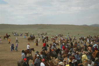 (Naadamfest 2005), die Reiter am Start und die Zuschauer,