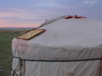 Die Nomaden begrüßen uns mit mongolischem Milchtee und Milchprodukten: getrocknetem Quark und Käse, Gebäck und frischem Rahm. Zum Abendessen werden wir reichlich bewirtet, für den Gast werden die Schalen immer wieder bis über den Rand gefüllt mit köstlichen selbstgemachten Nudeln, mit Fleisch und Brühe, Salat und Reis.