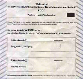 Wie ich die Hunde-Lobby kenne, werden sie sicher auch da wieder mitmischen und ein Mitglied wird gegen diese dubiose Wahl hoffentlich klagen. Aber sie passt eben zu Poggendorf. Hier kommt dann übrigens noch mal Hildegard Dobbertin ins Spiel, denn mir wurde gesagt, sie feiere unterdessen ziemlich genau 20 jähriges Jubiläum im "Kampf" gegen den HTV. Was gab es noch an Neuigkeiten? Die Hunde-Lobby wählte eine neue Vorsitzende und dazu bekamen wir die folgenden Zeilen: Angela Wierig