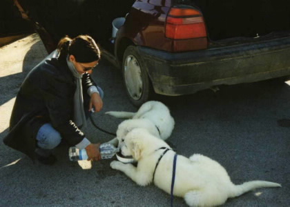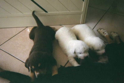 Ich fasste einen sehr mutigen Entschluss, denn ich hatte Angst, wenn ich nach einigen Tagen wieder kommen würde, wären vielleicht wieder einige gestorben und fragte den Hirten, ob ich 2 Welpen mitnehmen dürfte. Meine Familie hatte eine Entebucherhündin aus Deutschland mitgebracht, die gerade Welpen hatte. Ich versprach dem Hirten, die beiden sofort zurückzubringen, wenn es mit der Amme nicht klappen würde. Zu Hause angekommen nahm ich einen der Welpen unserer Hündin und streichelte abwechselnd die beiden weißen Welpen und ihn, um den Geruch auf die beiden Neuankömmlinge zu übertragen. Dann legte ich die beiden zwischen den anderen Welpen ans Gesäuge. Die Hundemutter beäugte sie nur kurz. Die beiden weißen Knäuel suchten sich sofort eine Zitze und begannen zu trinken.