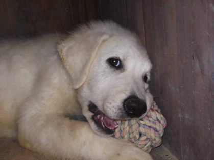 Eines Tages überraschte mich der Hirte. Er zeigte mir eine Maremmanohündin, die 12 Welpen zur Welt gebracht hatte. Ich war etwas schockiert über die hygienischen Bedingungen. Die Hündin lag in einem Holzverschlag, in dem es heftig zog. Sie lag mit ihren Welpen, die gerade 2 Tage alt waren, in einer Mulde, die sie sich gegraben hatte. Als ich nach einigen Tagen wieder vorbeischaute, fehlten einige Welpen. Der Hirte sagte, sie seien gestorben und das wäre ganz normal, denn nur die Stärksten würden überleben. Brutpflege gehöre nicht zu den Aufgaben eines Hirten, das müsste die Hündin selber machen.