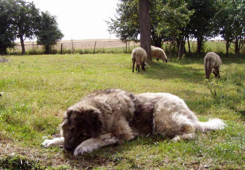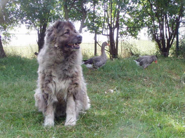 Große Hirtenhunde wie der Kaukase haben natürlich hier in Deutschland wenig Möglichkeit ihrer einstigen Bestimmung gerecht zu werden, ein geeignetes Grundstück und Familienanschluss sind deshalb Bedingung. Bei uns dürfen sie schon ein klein wenig als „Wächter einer Miniherde“ üben. Schafe, Ziegen und zeitweise auch Gänse dienen uns unter anderem als Rasenmäher. So gewöhnen sich die Welpen schon sehr zeitig an Nutztiere und respektieren sie. In den letzten Jahren geben wir oft Welpen in Hände von Menschen die hobbymäßig oder professionell Pferde, Schafe oder andere Tiere züchten, diese dürfen dann tatsächlich ein bisschen Hirtenhund sein. Vor 9 Jahren ging eine Kaukasenhündin zu einem Schäfer – sie erfüllt Ihre Aufgabe perfekt ! Andere leben mit Pferden und Rindern, auch das funktioniert sehr gut. Hexana, eine Tochter von Bainak und Lara lebt auf einem Hof mit Hühnern und Enten – es darf also auch mal Federvieh sein - ab und zu stielt sie ein Ei, aber das soll ja auch dem Fell gut tun. Es ist nur schade, dass wenig Bildmaterial existiert von diesen Hunden, da wir abhängig sind in dieser Beziehung von den Besitzern und die haben andere Interessen, als zu fotografieren.