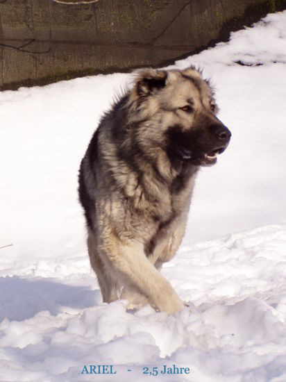 Und eines kommt für mich hinzu, Rosi Schlegel Birke war immer für „Experimente“ offen. So vermittelte ich 2004 eine Hündin aus Georgien, die in der Schweiz lebte an sie. Es war Lara und die ist sicher strittig, wenn man sie mit Kaukasen vergleicht, die man in Deutschland findet. Überflüssig zu schreiben, ich finde diese Hündin nicht nur sehr schön, sondern sie hat auch einen sehr guten Charakter. Daher passt sie in die „Truppe“ von Rosi und die Käufer von Lara – Welpen haben wiederum ihren Spaß.